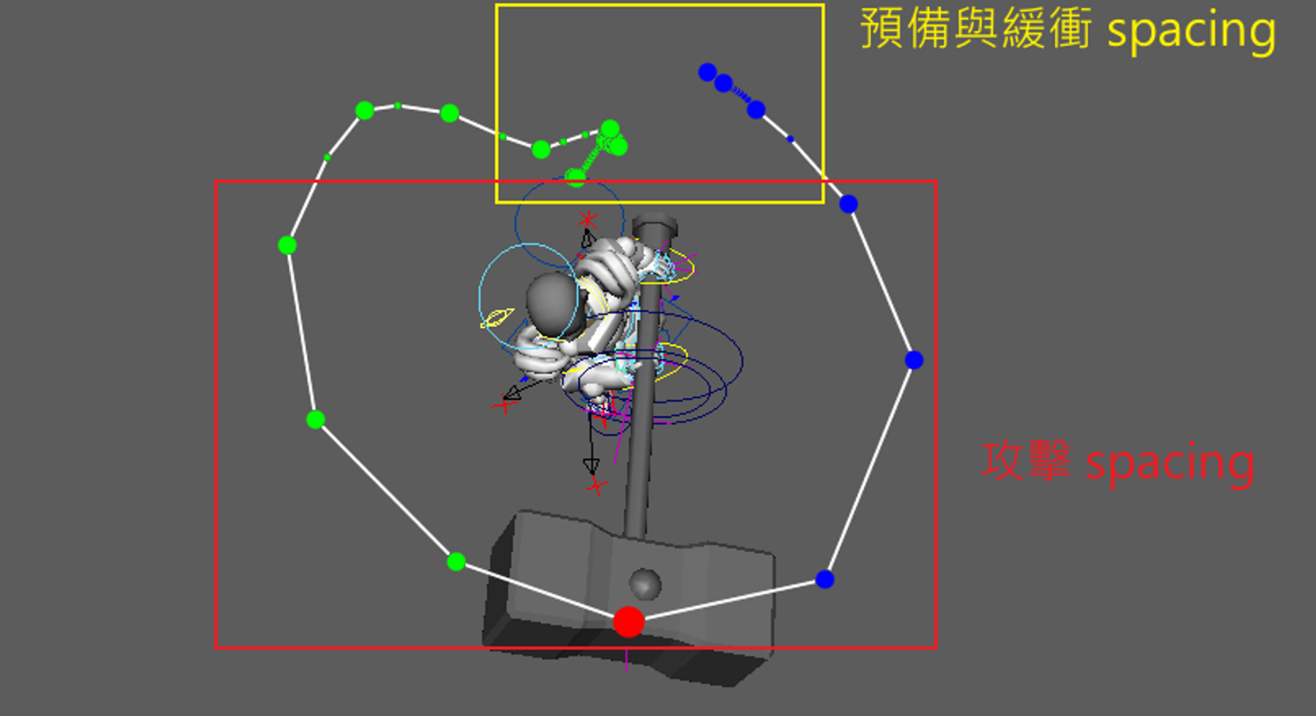 - 當攻擊間距較大且速度快與預備緩衝間距小且速度慢,會形成反差的對比,玩家在體感上也較可以明顯感受武器的重量